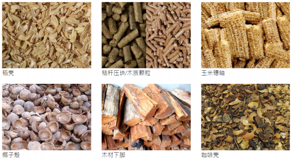 生质能燃料:稻壳、秸秆压块、木质颗粒、玉米穗轴、椰子壳、木材下脚、咖啡壳