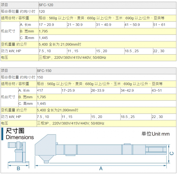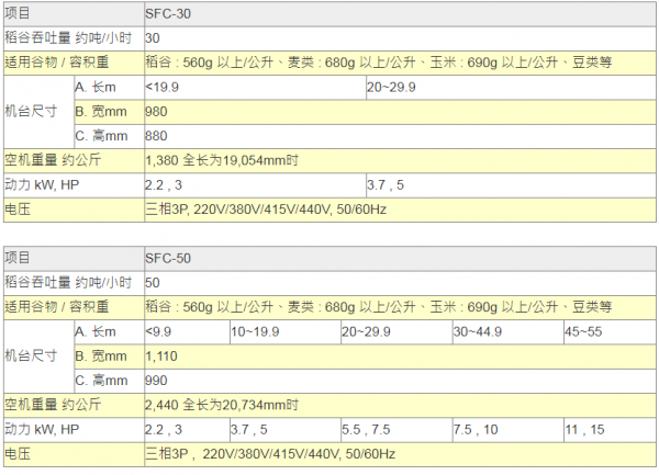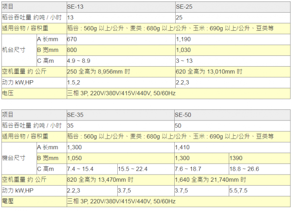 ●以上所列之吞吐量,是以稻谷容积重:1公升=560公克以上、小麦容积重:1公升=680公克以上、玉米容积重:1公升=690公克以上为测定基准。