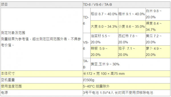 ●测定注意事项:本水份计是以日本谷物为标准,及采用日本检量线,会因地区性、大气温度、相对湿度、谷物品种之不同,所测得之水份会有误差。所以请依当地的国家标准,例如绝干法:5g粉碎的谷物,放入105°C的恒温箱,烘干5小时的作业方法,或配合当地粮管单位的水份计和本水份计做出对照表,再施行测定作业,显示出的水份值再看对照表的实际水份值,即本水份计的谷物含水率是参考值。